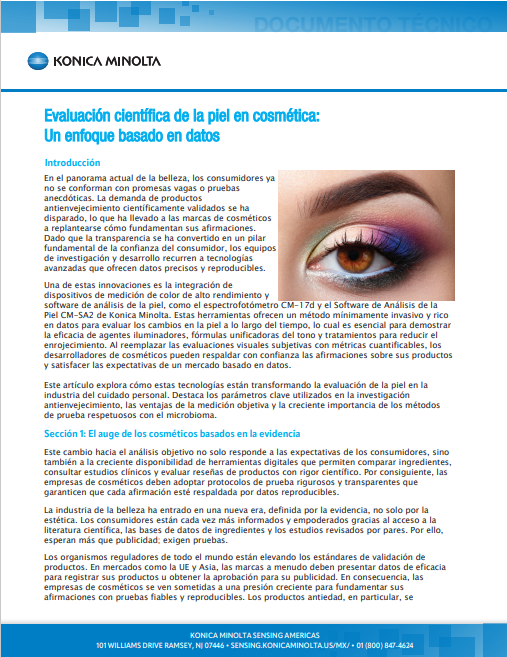 Descubre cómo el espectrofotómetro CM-17d de Konica Minolta y el software de análisis de piel CM-SA2 están revolucionando la investigación y desarrollo cosmética. Este documento técnico explora métodos objetivos y reproducibles para evaluar el tono de piel, el enrojecimiento y la pigmentación, capacitando a las marcas para fundamentar afirmaciones con precisión científica. Ideal para formuladores, investigadores y profesionales del marketing que buscan soluciones de prueba compatibles con el microbioma y consistentes a nivel global.