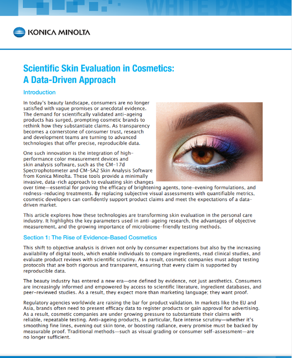 Discover how Konica Minolta’s CM-17d Spectrophotometer and CM-SA2 Skin Analysis Software are revolutionizing cosmetic R&D. This white paper explores objective, reproducible methods for evaluating skin tone, redness, and pigmentation—empowering brands to substantiate claims with scientific precision. Ideal for formulators, researchers, and marketers seeking microbiome-friendly, globally consistent testing solutions.